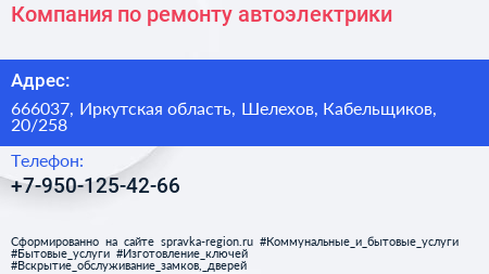 Компания по ремонту автоэлектрики по адресу 666037, Иркутская область, Шелехов, Кабельщиков, 20/258 в дальнейшем Организация, размещена в следующих категориях: