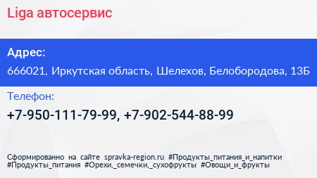 Liga, автосервис по адресу 666021, Иркутская область, Шелехов, Белобородова, 13Б в дальнейшем Организация, размещена в следующих категориях:
