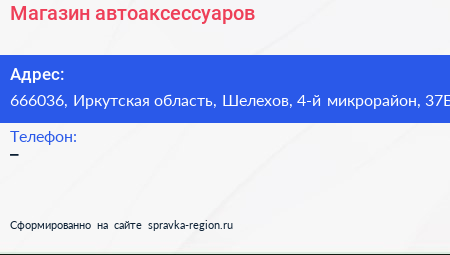 Магазин автоаксессуаров по адресу 666036, Иркутская область, Шелехов, 4-й микрорайон, 37Б в дальнейшем Организация, размещена в следующих категориях: