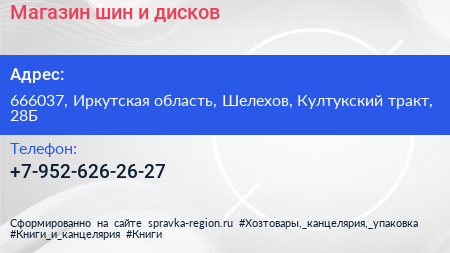 Магазин шин и дисков по адресу 666037, Иркутская область, Шелехов, Култукский тракт, 28Б в дальнейшем Организация, размещена в следующих категориях: