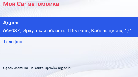 Мой Car, автомойка по адресу 666037, Иркутская область, Шелехов, Кабельщиков, 1/1 в дальнейшем Организация, размещена в следующих категориях:
