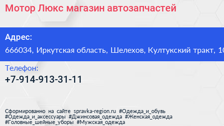 Мотор Люкс, магазин автозапчастей по адресу 666034, Иркутская область, Шелехов, Култукский тракт, 10 в дальнейшем Организация, размещена в следующих категориях: