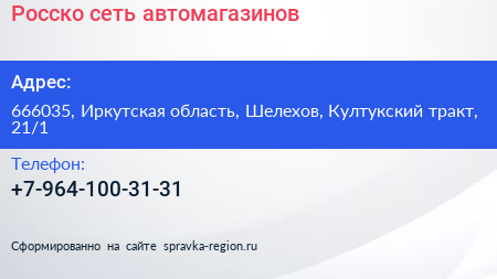 Росско, сеть автомагазинов по адресу 666035, Иркутская область, Шелехов, Култукский тракт, 21/1 в дальнейшем Организация, размещена в следующих категориях: