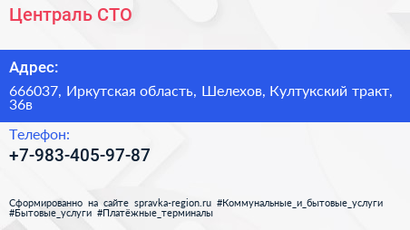 Централь, СТО по адресу 666037, Иркутская область, Шелехов, Култукский тракт, 36в в дальнейшем Организация, размещена в следующих категориях:
