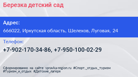 Березка, детский сад по адресу 666022, Иркутская область, Шелехов, Луговая, 24 в дальнейшем Организация, размещена в следующих категориях: