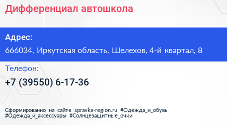 Дифференциал, автошкола по адресу 666034, Иркутская область, Шелехов, 4-й квартал, 8 в дальнейшем Организация, размещена в следующих категориях: