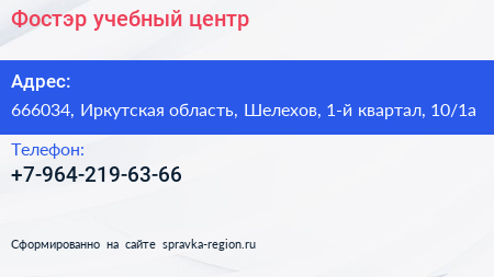 Фостэр, учебный центр по адресу 666034, Иркутская область, Шелехов, 1-й квартал, 10/1а в дальнейшем Организация, размещена в следующих категориях: