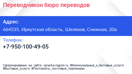 Переводчикон, бюро переводов по адресу 664535, Иркутская область, Шелехов, Снежная, 20а в дальнейшем Организация, размещена в следующих категориях: