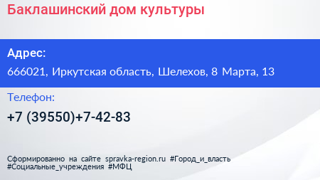 Баклашинский дом культуры по адресу 666021, Иркутская область, Шелехов, 8 Марта, 13 в дальнейшем Организация, размещена в следующих категориях: