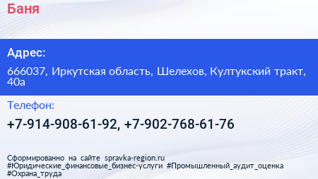 Баня по адресу 666037, Иркутская область, Шелехов, Култукский тракт, 40а в дальнейшем Организация, размещена в следующих категориях: