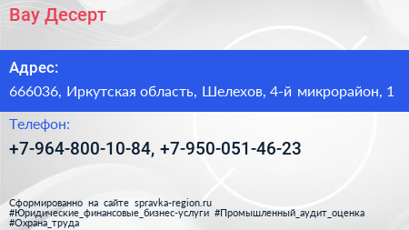 Bay! Десерт по адресу 666036, Иркутская область, Шелехов, 4-й микрорайон, 1 в дальнейшем Организация, размещена в следующих категориях: