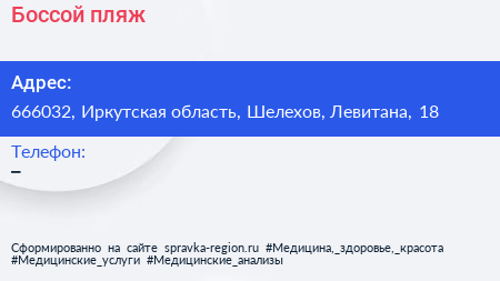Боссой, пляж по адресу 666032, Иркутская область, Шелехов, Левитана, 18 в дальнейшем Организация, размещена в следующих категориях: