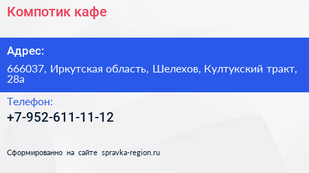 Компотик, кафе по адресу 666037, Иркутская область, Шелехов, Култукский тракт, 28а в дальнейшем Организация, размещена в следующих категориях: