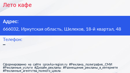 Лето, кафе по адресу 666032, Иркутская область, Шелехов, 18-й квартал, 48 в дальнейшем Организация, размещена в следующих категориях: