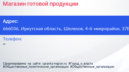 Магазин готовой продукции по адресу 666036, Иркутская область, Шелехов, 4-й микрорайон, 37Б в дальнейшем Организация, размещена в следующих категориях: