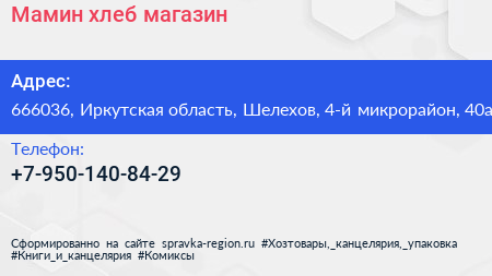 Мамин хлеб, магазин по адресу 666036, Иркутская область, Шелехов, 4-й микрорайон, 40а в дальнейшем Организация, размещена в следующих категориях: