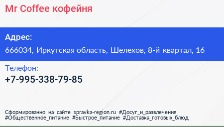 Mr. Coffee, кофейня по адресу 666034, Иркутская область, Шелехов, 8-й квартал, 16 в дальнейшем Организация, размещена в следующих категориях:
