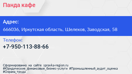 Панда, кафе по адресу 666036, Иркутская область, Шелехов, Заводская, 58 в дальнейшем Организация, размещена в следующих категориях: