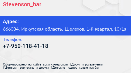 Stevenson_bar по адресу 666034, Иркутская область, Шелехов, 1-й квартал, 10/1а в дальнейшем Организация, размещена в следующих категориях: