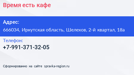 Время есть!, кафе по адресу 666034, Иркутская область, Шелехов, 2-й квартал, 18а в дальнейшем Организация, размещена в следующих категориях: