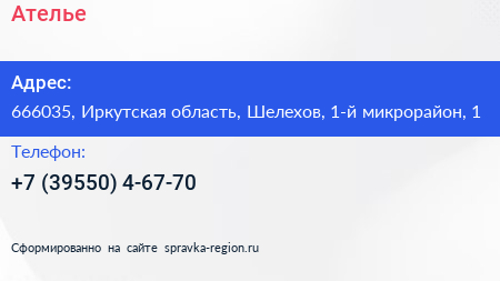 Ателье по адресу 666035, Иркутская область, Шелехов, 1-й микрорайон, 1 в дальнейшем Организация, размещена в следующих категориях: