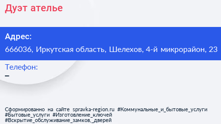 Дуэт, ателье по адресу 666036, Иркутская область, Шелехов, 4-й микрорайон, 23 в дальнейшем Организация, размещена в следующих категориях: