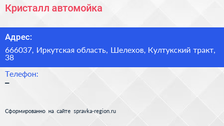 Кристалл, автомойка по адресу 666037, Иркутская область, Шелехов, Култукский тракт, 38 в дальнейшем Организация, размещена в следующих категориях: