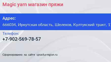 Magic yarn, магазин пряжи по адресу 666034, Иркутская область, Шелехов, Култукский тракт, 17 в дальнейшем Организация, размещена в следующих категориях: