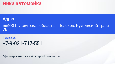 Ника, автомойка по адресу 666031, Иркутская область, Шелехов, Култукский тракт, 9Б в дальнейшем Организация, размещена в следующих категориях: