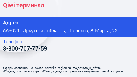 Qiwi, терминал по адресу 666021, Иркутская область, Шелехов, 8 Марта, 22 в дальнейшем Организация, размещена в следующих категориях: