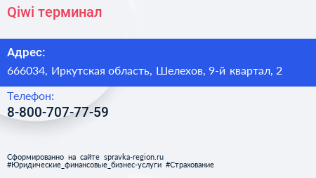 Qiwi, терминал по адресу 666034, Иркутская область, Шелехов, 9-й квартал, 2 в дальнейшем Организация, размещена в следующих категориях: