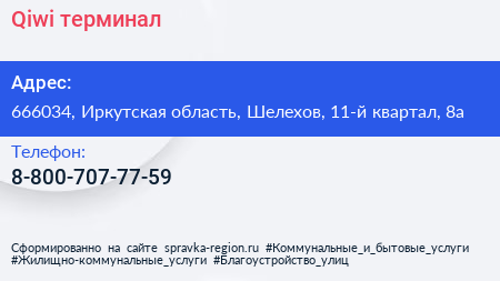 Qiwi, терминал по адресу 666034, Иркутская область, Шелехов, 11-й квартал, 8а в дальнейшем Организация, размещена в следующих категориях: