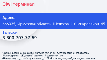Qiwi, терминал по адресу 666035, Иркутская область, Шелехов, 1-й микрорайон, 45 в дальнейшем Организация, размещена в следующих категориях: