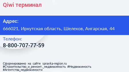 Qiwi, терминал по адресу 666021, Иркутская область, Шелехов, Ангарская, 44 в дальнейшем Организация, размещена в следующих категориях: