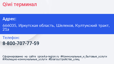 Qiwi, терминал по адресу 666035, Иркутская область, Шелехов, Култукский тракт, 21а в дальнейшем Организация, размещена в следующих категориях: