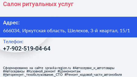 Салон ритуальных услуг по адресу 666034, Иркутская область, Шелехов, 3-й квартал, 15/1 в дальнейшем Организация, размещена в следующих категориях: