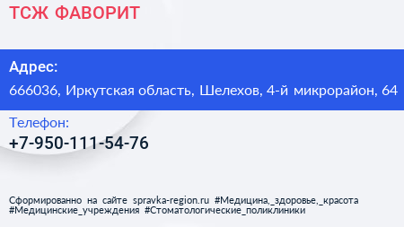 ТСЖ ФАВОРИТ по адресу 666036, Иркутская область, Шелехов, 4-й микрорайон, 64 в дальнейшем Организация, размещена в следующих категориях: