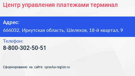 Центр управления платежами, терминал по адресу 666032, Иркутская область, Шелехов, 18-й квартал, 9 в дальнейшем Организация, размещена в следующих категориях: