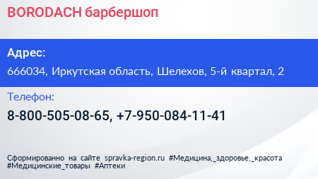 BORODACH, барбершоп по адресу 666034, Иркутская область, Шелехов, 5-й квартал, 2 в дальнейшем Организация, размещена в следующих категориях: