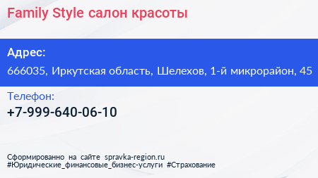 Family Style, салон красоты по адресу 666035, Иркутская область, Шелехов, 1-й микрорайон, 45 в дальнейшем Организация, размещена в следующих категориях: