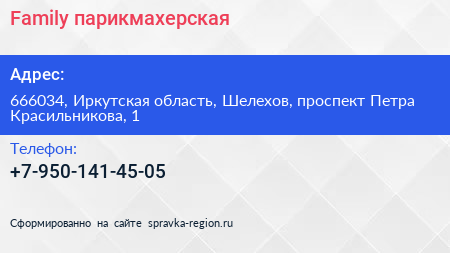 Family, парикмахерская по адресу 666034, Иркутская область, Шелехов, проспект Петра Красильникова, 1 в дальнейшем Организация, размещена в следующих категориях: