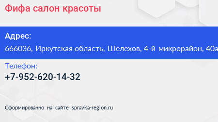 Фифа, салон красоты по адресу 666036, Иркутская область, Шелехов, 4-й микрорайон, 40а в дальнейшем Организация, размещена в следующих категориях: