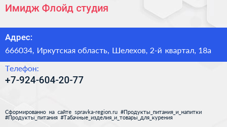 Имидж Флойд, студия по адресу 666034, Иркутская область, Шелехов, 2-й квартал, 18а в дальнейшем Организация, размещена в следующих категориях: