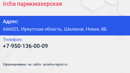 Ircha, парикмахерская по адресу 666021, Иркутская область, Шелехов, Новая, 8Б в дальнейшем Организация, размещена в следующих категориях: