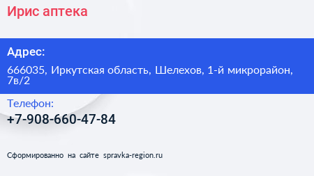 Ирис, аптека по адресу 666035, Иркутская область, Шелехов, 1-й микрорайон, 7в/2 в дальнейшем Организация, размещена в следующих категориях: