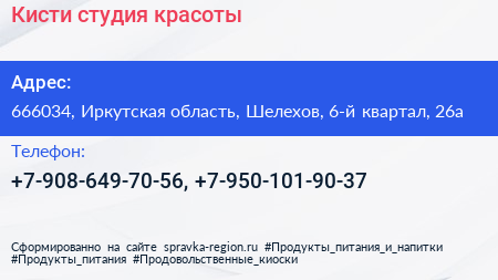 Кисти, студия красоты по адресу 666034, Иркутская область, Шелехов, 6-й квартал, 26а в дальнейшем Организация, размещена в следующих категориях: