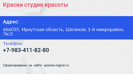 Краски, студия красоты по адресу 666035, Иркутская область, Шелехов, 1-й микрорайон, 7в/2 в дальнейшем Организация, размещена в следующих категориях: