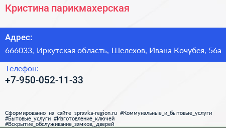 Кристина, парикмахерская по адресу 666033, Иркутская область, Шелехов, Ивана Кочубея, 56а в дальнейшем Организация, размещена в следующих категориях: