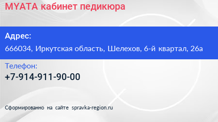 MYATA, кабинет педикюра по адресу 666034, Иркутская область, Шелехов, 6-й квартал, 26а в дальнейшем Организация, размещена в следующих категориях: