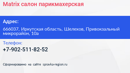 Matrix, салон-парикмахерская по адресу 666037, Иркутская область, Шелехов, Привокзальный микрорайон, 10а в дальнейшем Организация, размещена в следующих категориях:
